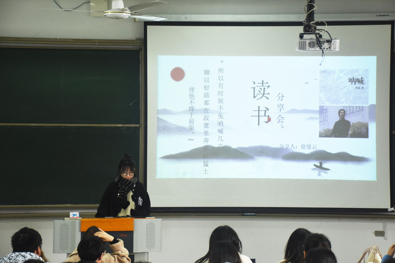 首先由张千慧同学从作者简介、作品简介、内容概述、解读分析、总结启示五个方面对《呐喊》进行了总体的介绍与剖析,并揭示了其内容所展现出的作者的内心精神世界。随后,徐曼云同学从作者简介、作品阅览、内容精选、反思精读四个方面与同学们探讨了自己对《呐喊》的读书感悟,剖析了书中作品的时代背景以及作者对当时被封建思想笼罩下的社会中形形色色的人与故事的所思所想。经小组讨论后,在场的同学们也纷纷交流自己的心得体会,分享了自己的阅读感悟。分享会的最后,周燕明对同学们的交流与发现进行了点评,对同学们细读《呐喊》而获得的深刻感悟提出了表扬,同时指出端正读书态度及个性化阅读的重要性,并提出了大家应认真研读经典名著的倡导。