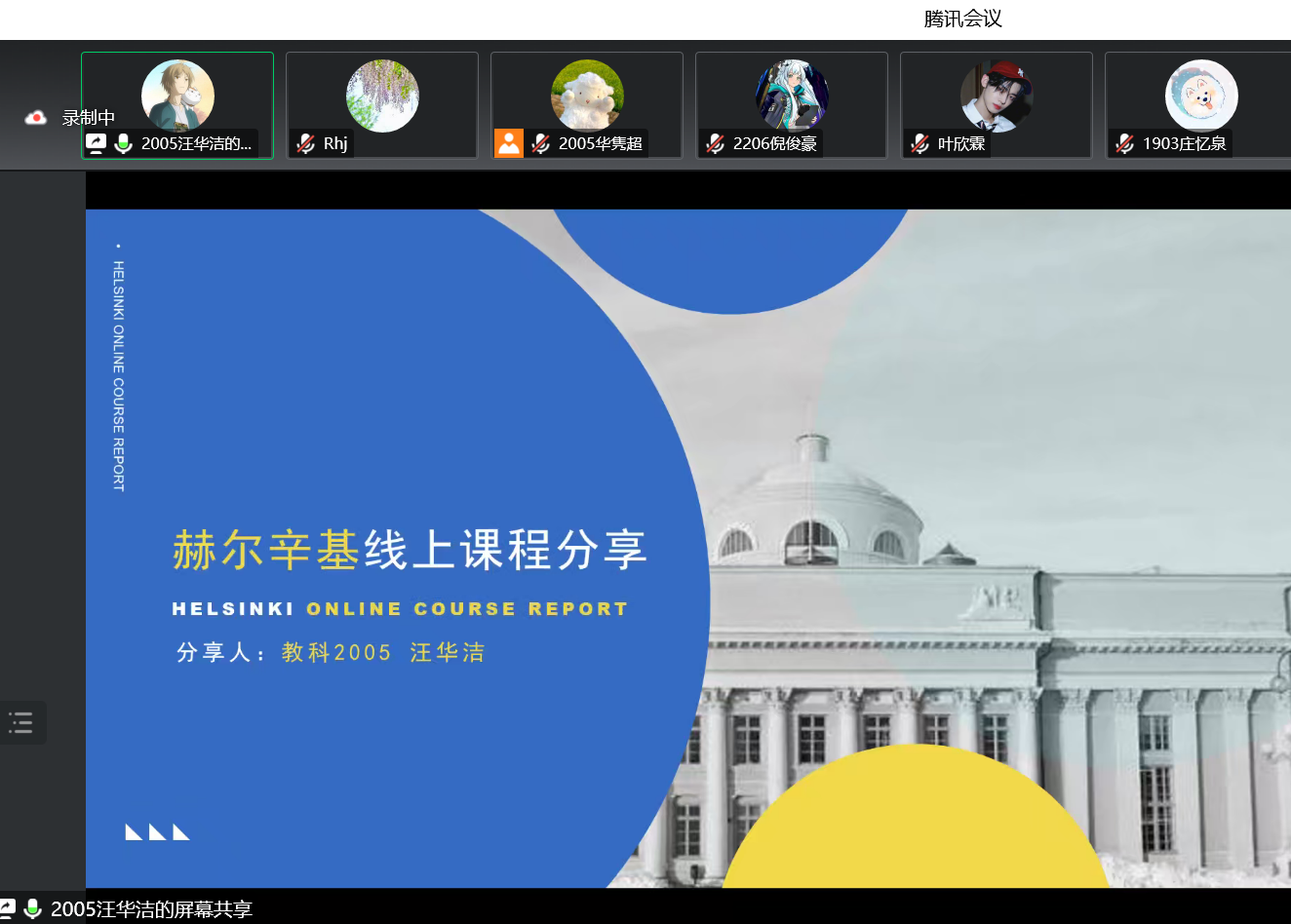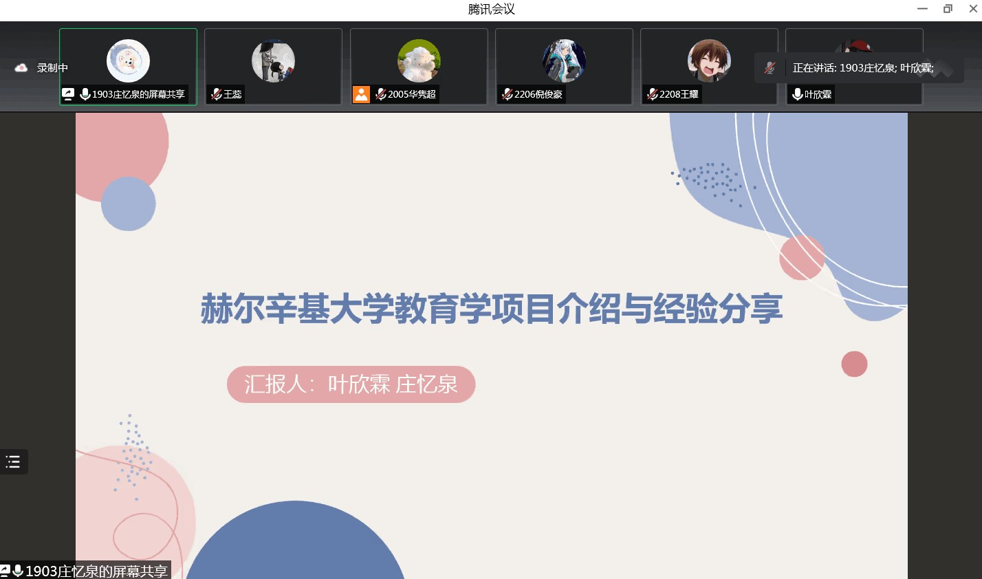 交流会伊始,华隽超从总体上介绍了赫尔辛基大学教育学系教授集中授课的境外学习项目。她从政府、学校、家庭和教师四个方面介绍了芬兰的教育,由此引出芬兰的教师教育的三个特点,并表示她所参加的课程深刻体现了芬兰的教师培养特色,其中有两个学习方式令她印象深刻:档案袋学习和“让学习者转变为老师”。通过提问学习,她明白了要勇于尝试。随后,由庄忆泉和叶欣霖进行赫尔辛基大学教育学项目介绍与经验分享。