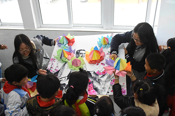 来自于小学教育、学前教育、应用心理、教育技术专业的40余名“准教师”们充分发挥专业特长,深入到小学课堂开展了“大手拉小手,沿着周爷爷的足迹前进”主题活动,为200余名乡村留守儿童带了丰富、有趣的课堂教学。志愿者以《从此励志为中华》等小故事带领着小学生们了解了一位“为中华之崛起而读书”的有志少年,生动的故事,感人的情节,深深感染了在座的小学生们。学前专业大学生与孩子们大手拉小手用五颜六色的彩纸折起了一朵朵漂亮的海棠花,在活动中寄托了对周爷爷的深深怀念。心理学专业的大学生们在前期充分调研留守儿童心理发展状况的基础上,与留守儿童开展了解手链等心理团队活动,寓教于乐,灿烂的笑容在留守儿童的脸上悄然绽放。分别之时,六年级的许双圆同学拉着大哥哥的手说:“大哥哥、大姐姐你们能经常来陪我们吗?希望能和你们成为知心好朋友,给我们带来快乐与知识。我也要向周爷爷那样,团结他人、刻苦学习,努力成为一名对国家有用的人”。