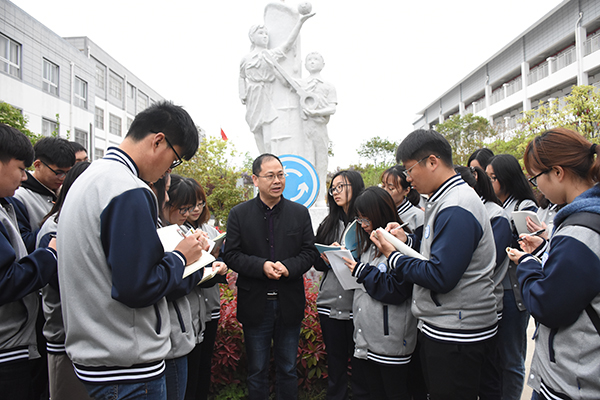 泗洪县感动教育十大人物、校友高杰校长在界集小学“未来·希望”雕像下用自己近20年生动的教育实践为教科院“准教师”们上了一堂生动的“实境课”。他与大学生们分享了自己成长历程,1998年从淮阴师院毕业,他被分配到泗洪县大楼乡黄庄小学,偏僻的村小、破旧的校舍曾让他心凉,但看到了100多双渴求的眼睛,他爱上了这所村小,爱上了这里的孩子,后来几次可以进城工作的机会,他都婉言谢绝了,这样一干就是二十年,而且会用一生去守护乡村教育。他衷心希望母校的师范专业大学生们,要牢记新时代赋予的历史使命,争做向周恩来总理那样的人,不忘初心,将自己培养成有理想信念、有道德情操、有扎实学识、有仁爱之心的好老师,立志扎根农村,奉献一生。小学教育专业的宋斐娴同学说:高杰学长的成长之路就是一本生动的教科书,让我受到了很大的启发与触动,他教会了我如何理解“职业”与“事业”的区别,让我认识到了我们师范生们为振兴乡村教育所要担负的使命与责任,回校以后,我一定做周恩来精神的学习者、实践者、传承者,讲好我们校友们扎根农村的感人故事,让更多的师范生加入到振兴乡村教育的队伍中来。