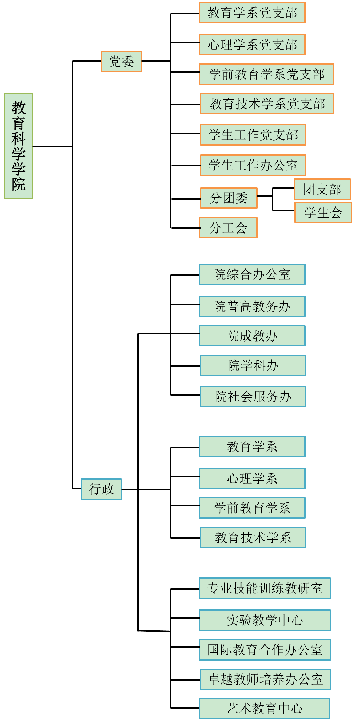 组织机构教育科学学院机构设置 基层教学组织负责人 教育学系:系主任:任建波;副主任:董莹、周燕明 学前教育系:系主任:宋臣;副主任:王崇丽 教育技术学系:系主任:蒋霞;副主任:申小春 心理学系:系主任:王冠;副主任:李继利 专业技能训练教研室主任:张曦敏 实验教学中心主任:黄立冬 国际教育合作办公室主任:赵正新 大学生创新创业办公室主任:卢强;副主任:张笑予 教育科学学院教学督导组 组长:昌晓莉 成员:谢同祥、刘国艳 教育科学学院教学指导委员会 主任委员:杨绪辉 秘书:吴桂花、曹琪敏 委员:张娟、任建波、蒋霞、王冠、昌晓莉、宋臣 教育科学学院学术委员会 主任委员:曹如军 秘书:范洁慧、陈太忠 委员:葛军、谢同祥、张娟、杨绪辉、卢强、皮武 教育科学学院学位评定委员会 主任委员:曹如军 秘书:吴桂花、曹琪敏 委员:葛军、戴云、杨绪辉、张娟、任建波、蒋霞、王冠、宋臣 |